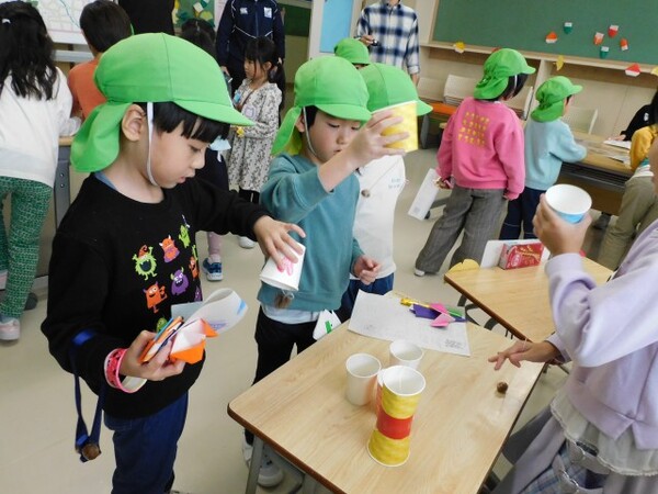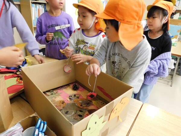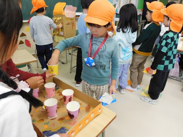 1年生のお兄さん、お姉さんが用意してくれたゲーム(ドングリや落ち葉など自然のもので作ったもの)で楽しみました。さすが1年生。呼び込みからゲームの説明、お手伝いとフル回転で年長組さんを楽しませてくれました。「来年は自分たちがお世話するよ」という気持ちが芽生えてきたようです。