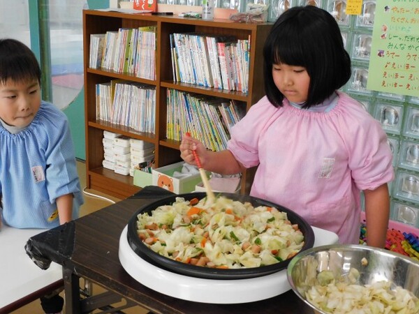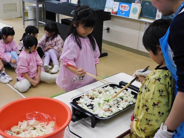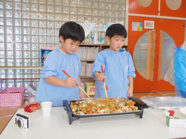 ホットプレートを使って野菜炒めを作りました。焼きそばもちょっと入れて…。長い菜箸を使って炒めるのが難しかったようです。あさひ組もわかば組もおいしく出来あがりました。最後はみんなでご挨拶。おいしいひと時になりました。