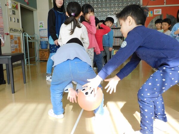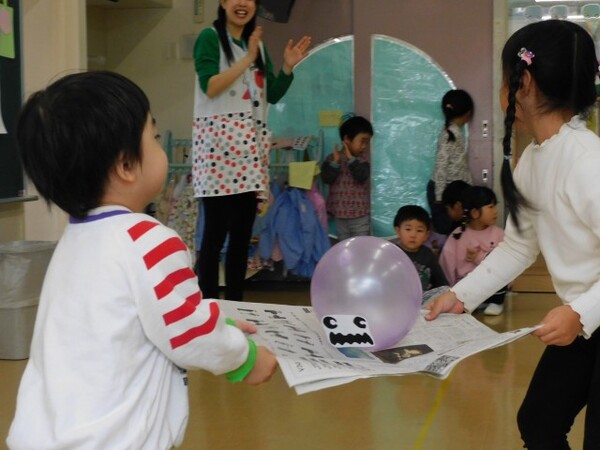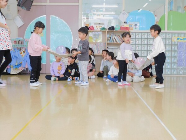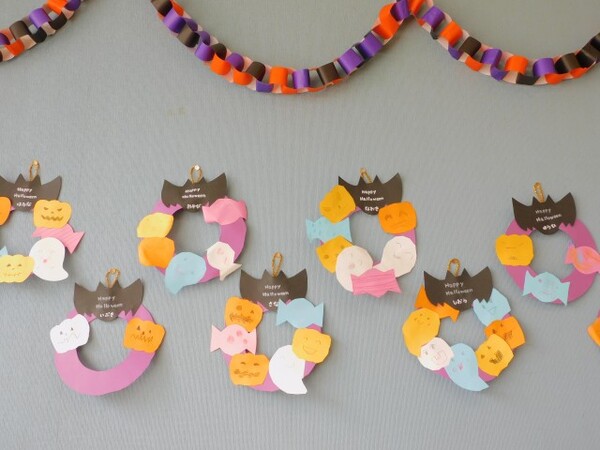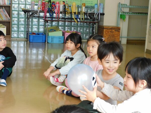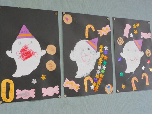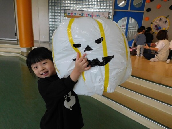 わくわくデーのお楽しみ。今日はハロウィンパーティーです。縦割りのグループで集まり、まずはおばけのシルエットクイズが始まりました。みんな真剣モードです。お部屋にはみんなが作ったハロウィンの飾りつけも。そのあとはおばけの風船で遊びました。にじ組さんはおばけかぼちゃの大きな風船やクモの巣にボールを貼ったり…。楽しい1日になったようです。