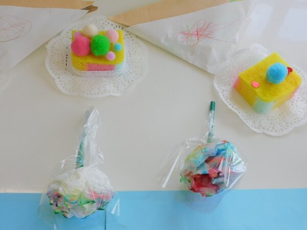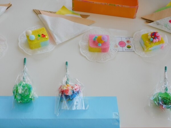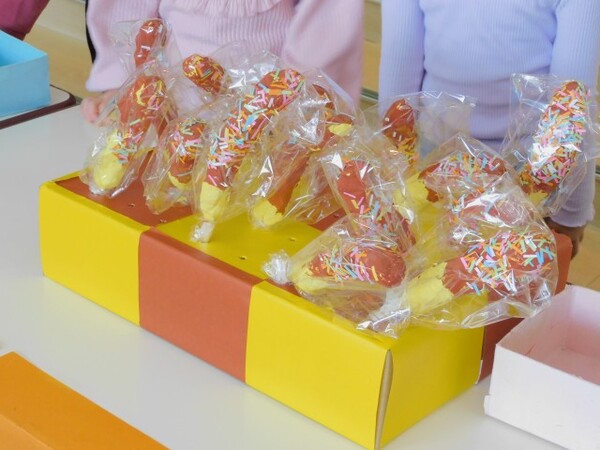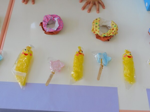 ぽてとクラブでおみせやさんごっこをしました。おにぎりやドーナツをつくって売りました。つりをしたり、ポップコーンを買いました。