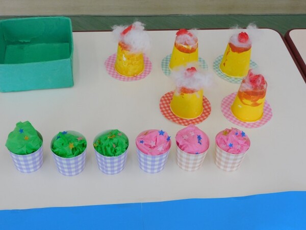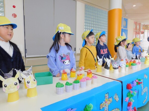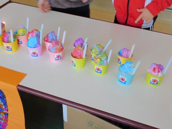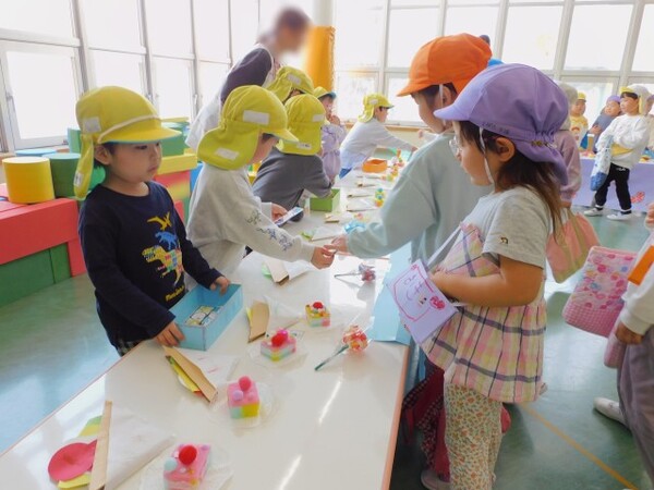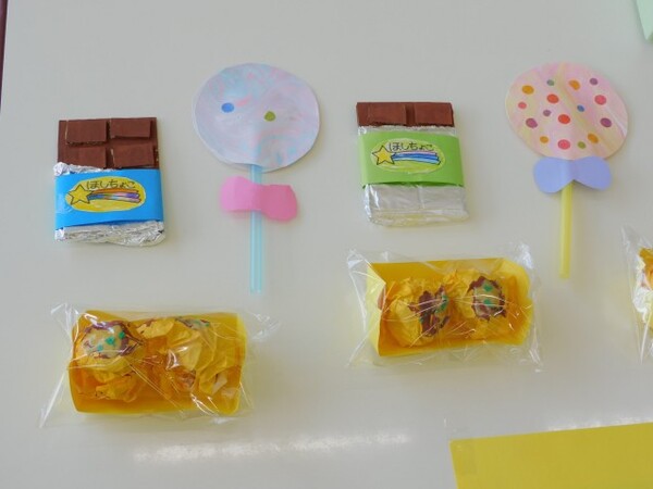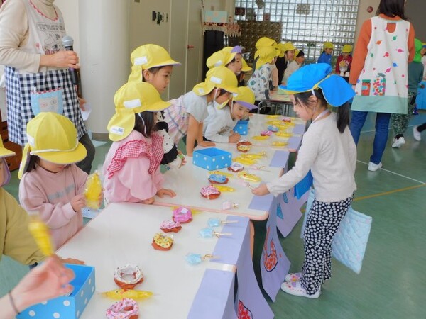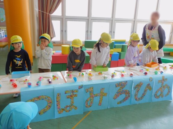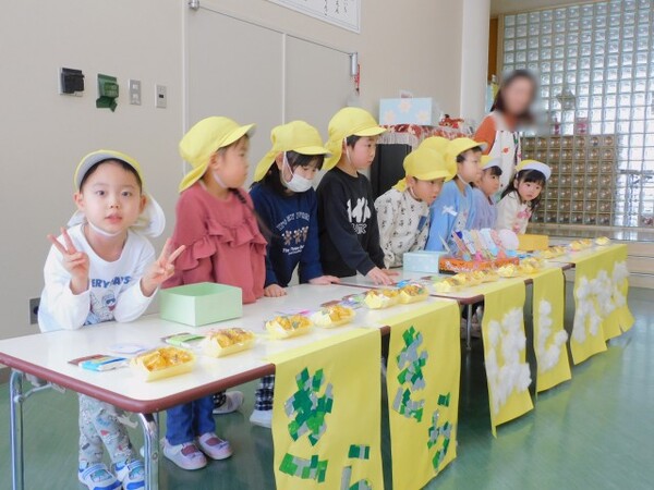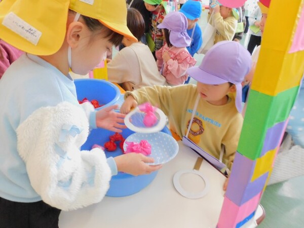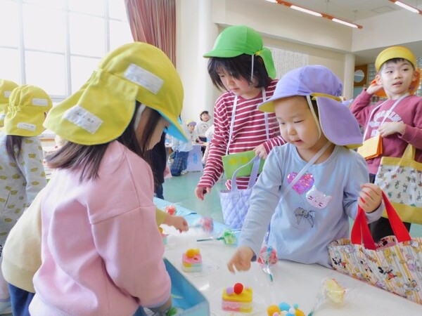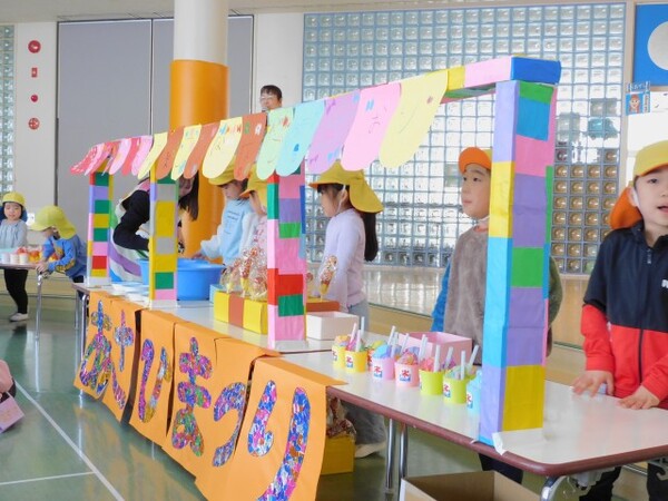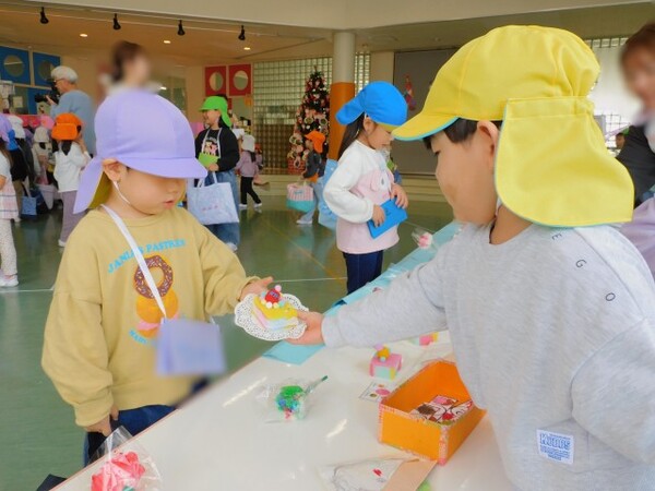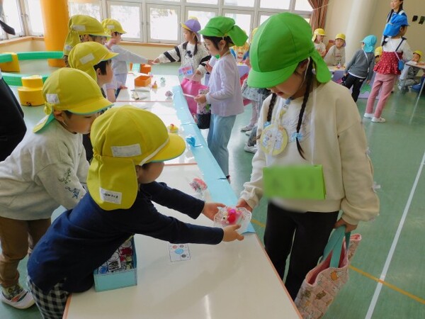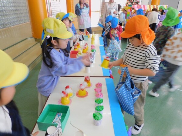 今日のわくわくデーは「お店やさんごっこ」です。各クラスで作った売り物を、売る人と買う人でわかれて交代で楽しみました。一人50円(自分で作ったお金)で買い物をします。※にじ組は1人30円でお買い物をします。全て1個10円の激安ストアです。売る人は最後に40円(にじ組は30円)のお給料をもらいます。ホールいっぱいに「いらっしゃい!」の声が響き渡りました。どれを買おうかな?目移りしてなかなか買えない子、気に入ったものを何回も買おうとする子、その子その子の楽しみ方で楽しい1日を過ごしました。