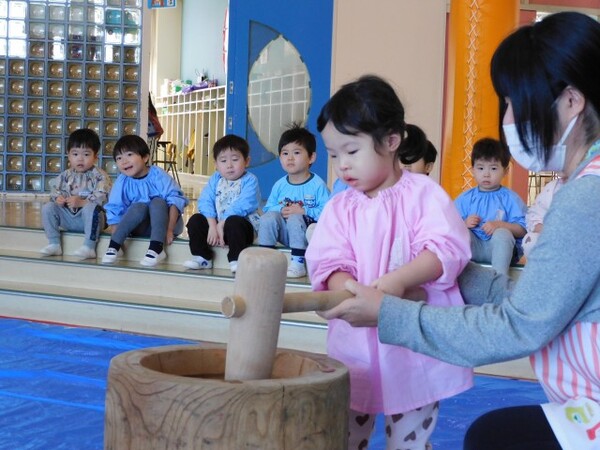 一人10回ぺったん、ぺったんと子ども用の杵を使ってお餅をつきました。ついたお餅は玄関ホールに「鏡餅」にして飾っています。