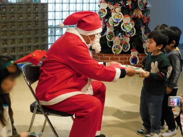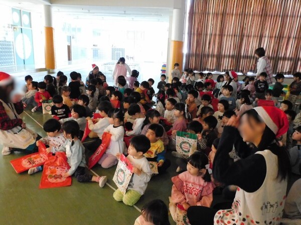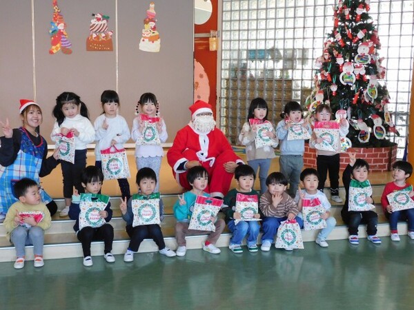 12月19日(金)今日は待ちに待っていた「クリスマス会」。はじめに、全員で「あわてんぼうのサンタクロース」をノリノリで歌って踊りました。さて、その次は…。トナカイのそりに乗ってサンタクロースが登場!「ふくずみ幼稚園の良い子にプレゼントを持ってきたよ!」秋にサンタクロースから幼稚園にカブトムシの幼虫のプレゼントが届きました。そのサンタさんがやってきました!「幼虫は元気に育っているかな?」とサンタさんからのご挨拶。子どもたちは「園長先生じゃないの?」「本物のサンタさんだ!」と大喜び。サンタさんから一人ひとりにプレゼントが渡され、思わずハグをしてもらう子もいました。最後にサンタさんを囲んでクラスみんなで写真に納まりました。楽しい大興奮の1日となりました。サンタさんまた来年も来てね!