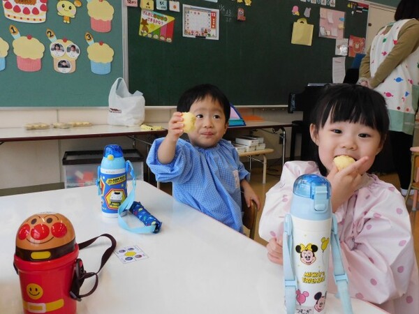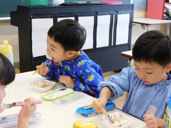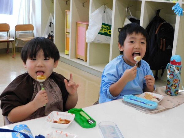 子どもたちは購入した一口サイズのお餅を食べました。にじ組の子どもたちは蒸しパンを食べました。