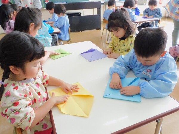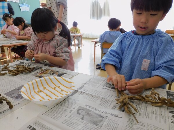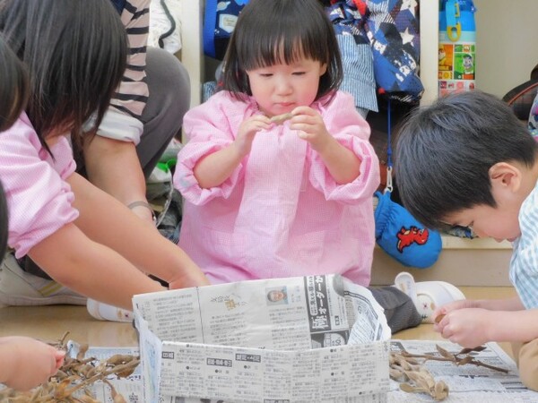 今日のわくわくデーは「豆まきの準備」。豆まき用の豆を入れる自分の枡をつくりました。枡が出来上がると、今度は夏に育てていた大豆を畑の先生が乾燥させてくださっていたので、乾燥したさやから黄色い大豆を取り出しました。はじめは「われない!」「むずかしい!」と弱音を吐いていた子もコツをつかむとたくさんの大豆を取り出すことができました。さあ、これで準備完了です。「豆まきの日に来る鬼をやっつけるぞ!」と鬼退治を楽しみにしている子どもたちでした。