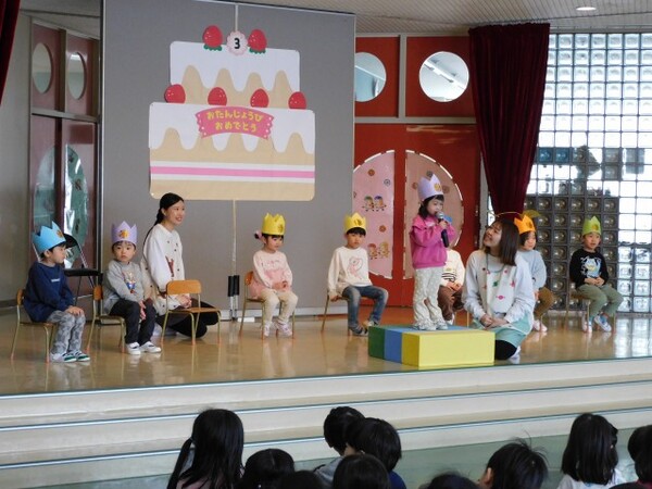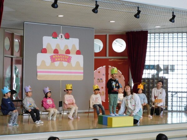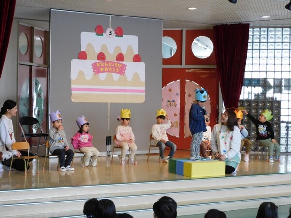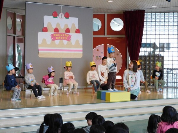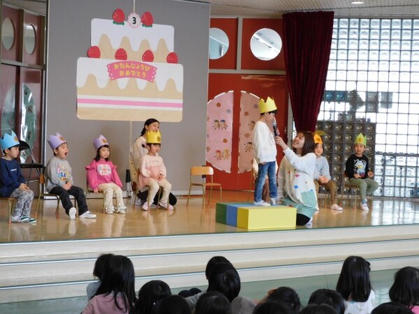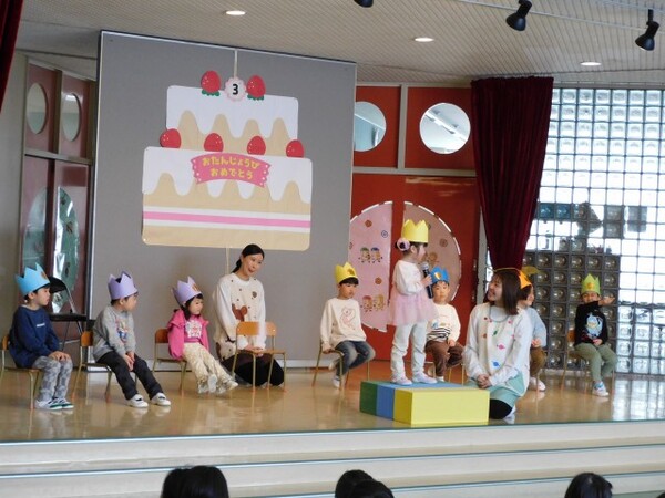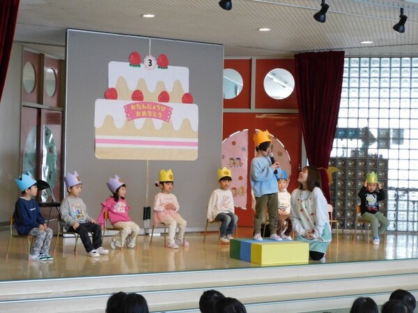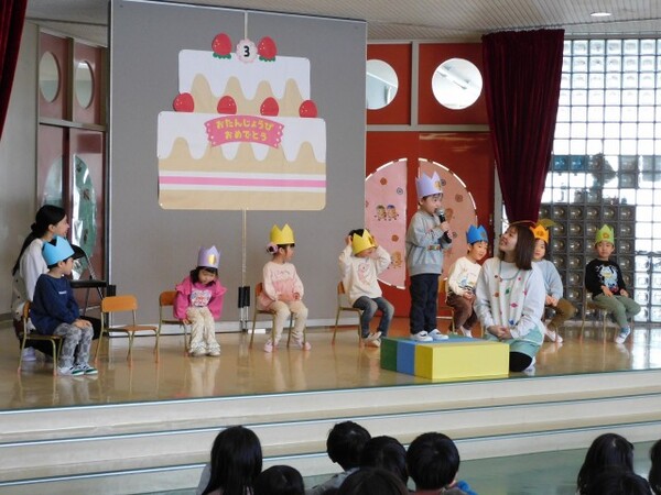 3月生まれさんお待たせしました。一年間お友達のお誕生日をお祝してきました。今日は待ちに待った3月生まれさんのお誕生会。おおきくなったら何になりたいかを元気に発表できました。