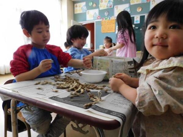 8月27日(水)2学期早々、えだまめやピーマンの収穫を行いました。えだまめは各クラスごとにさやと枝を分けました。初めての体験のにじ組さん、年少さんも上手に出来ました。年長さんはクラス農園のピーマンも収穫しました。巨大(?)なピーマン、かぼちゃみたいなピーマン?等楽しんで収穫しました。はじめはピーマンを上の方に持ち上げると上手に収穫できるという畑の先生のアドバイス通りにはなかなか上手にいきませんでしたが、慣れてくる収穫のスピードが速くなり楽しく収穫できました。